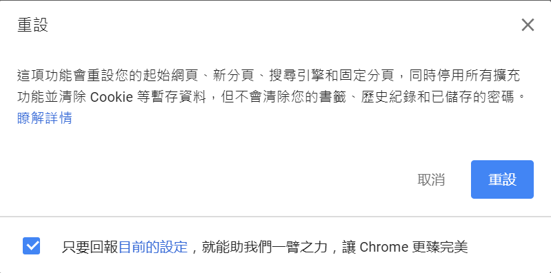 首先是關於一些擴充軟件的檢測,有些外掛會偷偷修改你的瀏覽器設定,如果遇到這種情況,Chrome 會提供「重設」選項,重設你的起始網頁、搜尋引擎及固定分頁,同時停用所有擴充功能並清除 Cookie 等暫存資料,但不會清除書籤、歷史紀錄及已儲存的密碼,也能透過下面連結來設定「chrome:// settings / resetProfileSettings」。