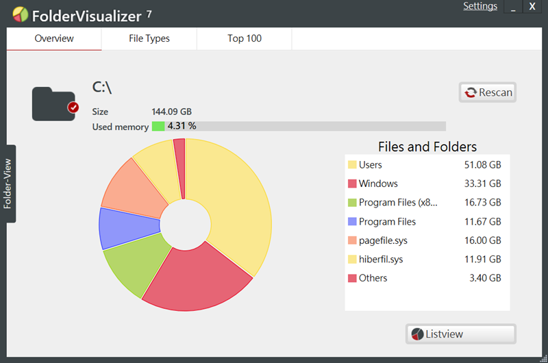 MeinPlatz - 電腦裡的檔案佔了多少空間?快速掃描並顯示資料夾目錄」這篇文章後,有兩三個朋友跟阿湯反映說不錯用,但字真的太小用內建的放大鏡看也很麻煩,今天阿湯就來補充「FolderVisualizer」這套軟體,同樣可以掃描電腦並分析硬碟、記憶體使用狀況,還能切換成圓餅圖來顯示容量比例,並列出內部檔案大小排名,而且介面更簡單、直覺,更適合討厭介面密密麻麻的朋友們。