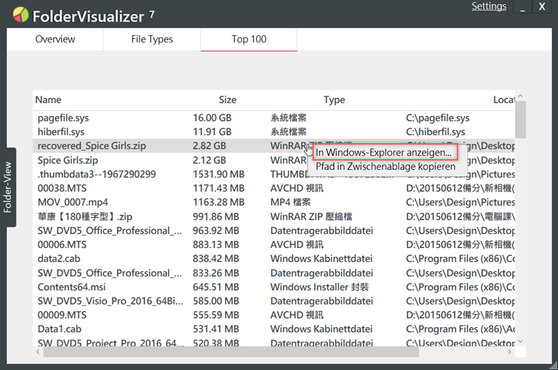 Top 100 這邊是跳過資料夾直接將檔案拉出來,如果要找大檔案從這邊刪最快,有的檔案阿湯真的忘記是幹嘛的,點右鍵選擇連到檔案位置來查就知道是什麼了,不需要就刪除吧。