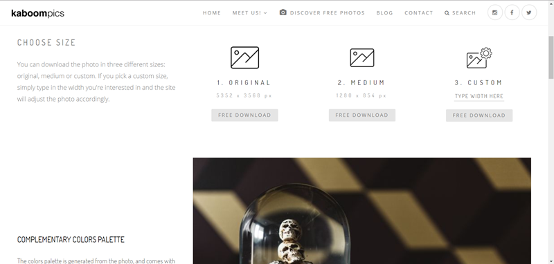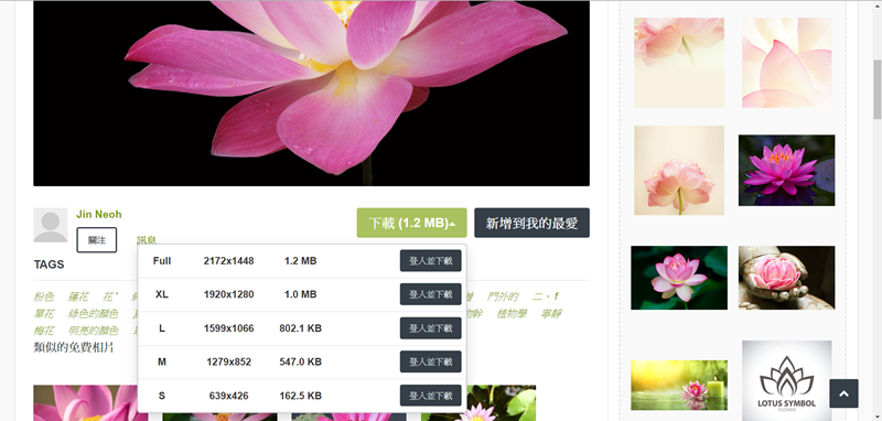 照片下方提供三種下載方式,可透過分享來收藏不同尺寸、類型的檔案。