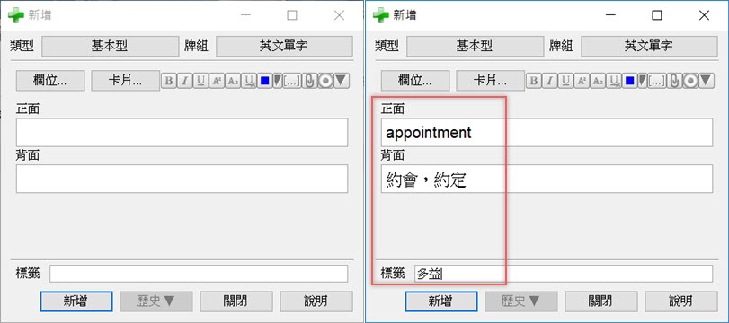 開始新增卡片吧,這應該是使用這套軟體前最大的工程了,輸入正反面內容、標籤,字型和樣式都能更改。