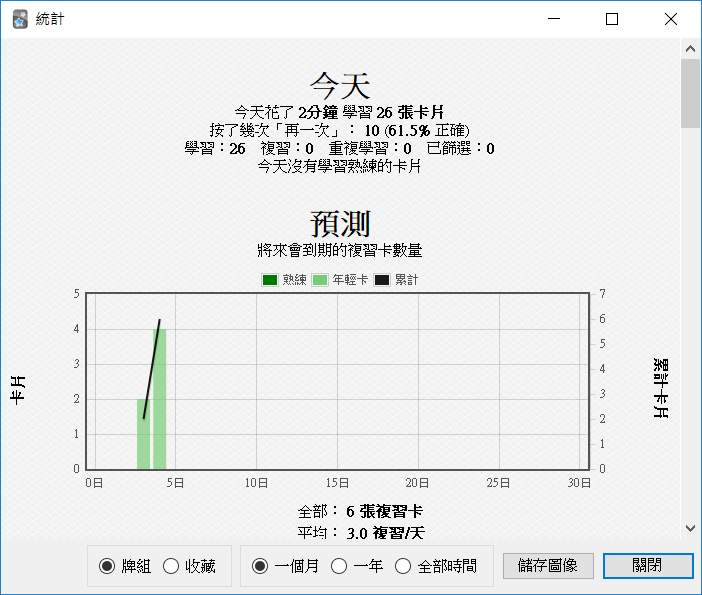 首頁右上方的統計點進來可看到目前的學習紀錄,多少時間學了多少、以及預測將來會到期的複習卡數量,對於學習狀況的分析很有幫助。