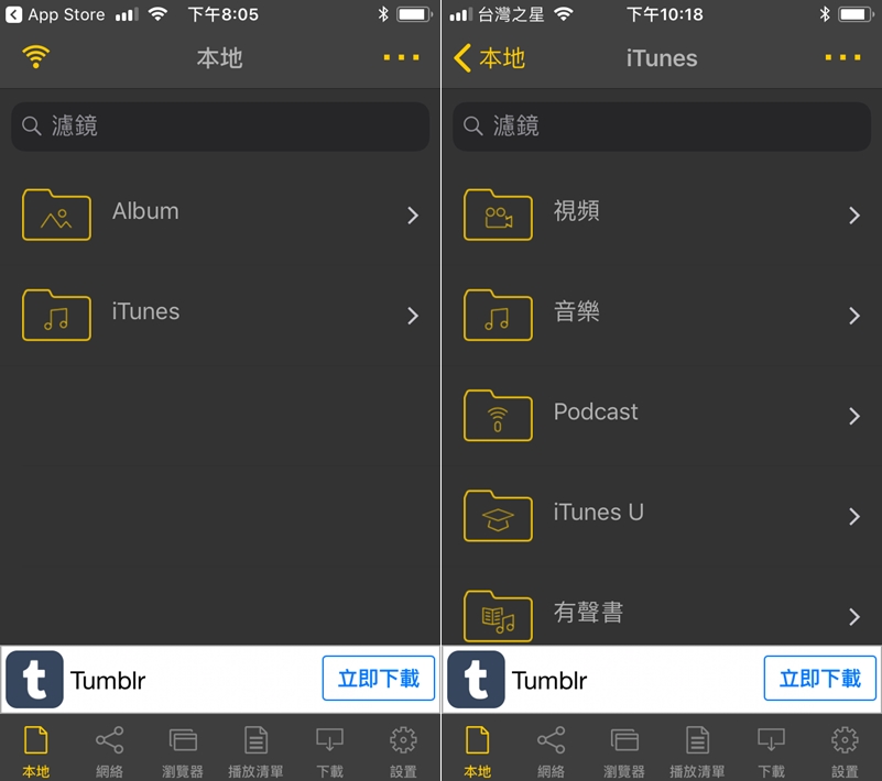 開啟後可先瀏覽本地(手機中)的檔案,包括相片、iTunes 裡的影片、音樂、有聲書等。