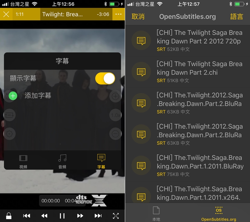 如果影片本身沒有字幕,除了可使用手機中儲存的字幕檔之外,還能從「OpenSubtitles.org」這個網站來找,進來後會自動搜尋相關檔案,點選就會加進去。