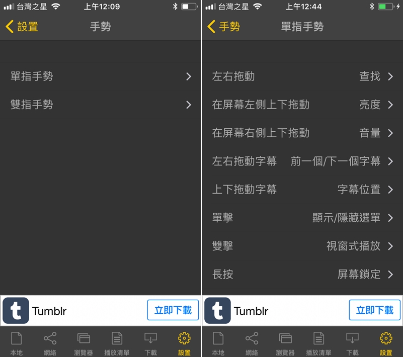 還有單指、雙指的手勢設定,不管是螢幕亮度、音量、視窗式播放…都可以讓你自由調整成習慣的方式來使用。