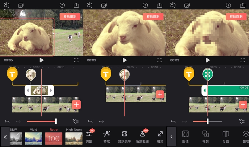 加入影片後除了可在影片前後添加圖片,還能直接覆蓋,並提供不同風格的濾鏡套用,也能再做圖樣或複製等其他調整,因為是免費版所以你用到一半顯示已達圖層上限是正常的。