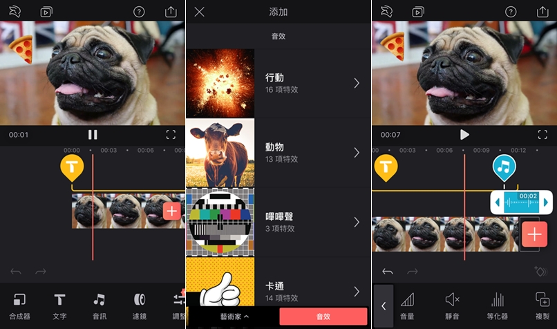 內建超過 100 種音效並以類型顯示,點擊加入即可。