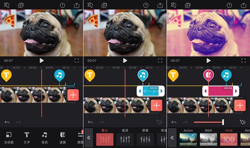 介面很好懂,開啟後先點中間加號看要加入圖片或影片,底下則是合成器、文字、音訊、濾鏡等選項,阿湯先單獨用相片試試,隨便套個特效感覺就不一樣了。