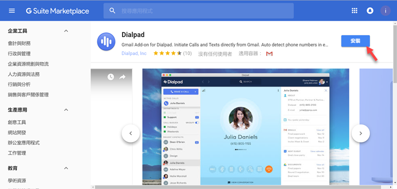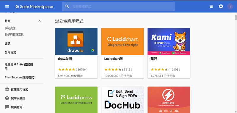 或者到外掛商店去逛逛,左欄分企業工具、生產應用、教育、通訊、公用程式四大類,內容再細分其他用途如客戶管理、工作管理,常用的辦公室應用程式如心智圖、轉檔、文件整合也都找得到。