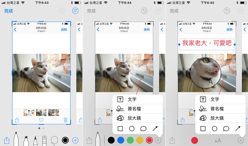 常用螢幕截圖的朋友一定會發現,現在你擷取後的圖片會被收在左下方,等個幾秒才會消失,這時你點開截圖就可進行編輯,包括三種筆刷加橡皮擦、六種顏色,還能加入文字、簽名檔、圖形及箭頭,嫌圖片太小也能用放大鏡檢視。