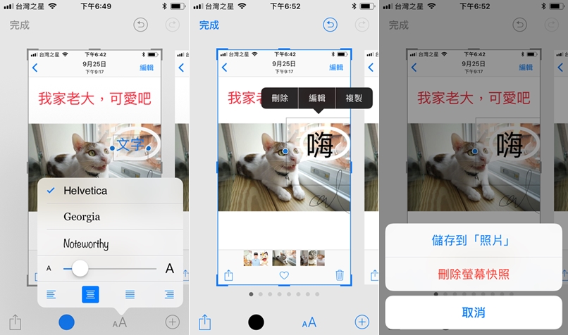 字型、粗細、擺放位置都能調整,不過現在選項比較少就是,完成後可點左下角分享或是存到手機,不想要也能在這裡直接刪除,不用進到相簿。