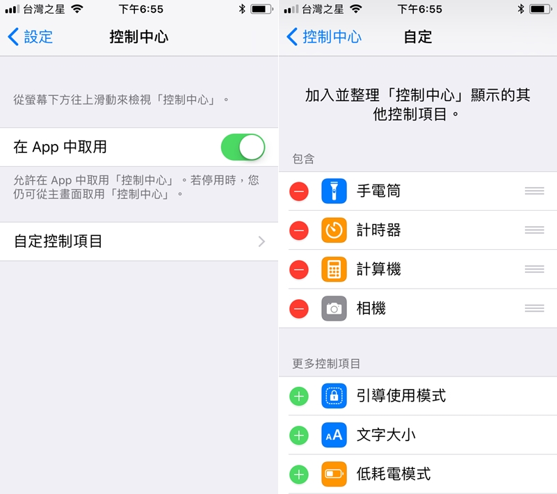在設定的地方進入控制中心,底下其他控制項目都能視需求加入,點綠色加號移動即可。