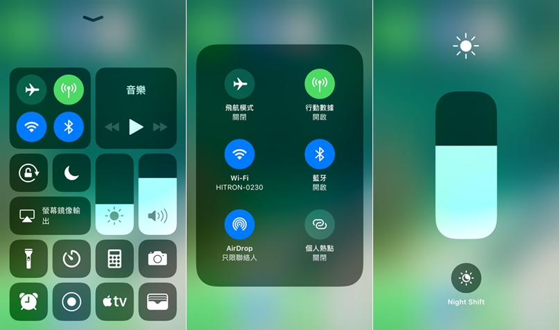 螢幕往上滑開啟控制中心,除了可看到剛剛設定的結果,還可藉由長按圖示來檢視與調整,像亮度就可以在這裡快速更改。
