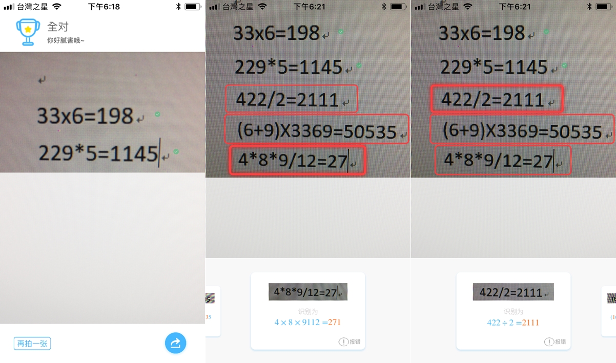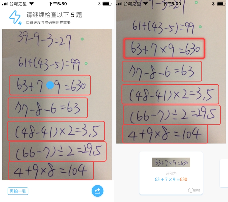 因為身邊沒有紙本數學題,所以先全部用手寫試試,拍照時會出現參考線,對準題目按下即可,判讀結果有小型綠勾勾的是正確的,但因為手寫不夠整齊,所以被框起來的除了錯誤的答案外,還有判讀失敗的,點擊會顯示辨識結果可對照。