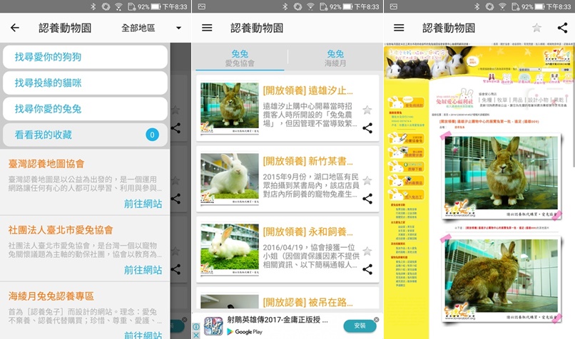 這款 APP 目前只有 Android 版,使用非常簡單,開啟後選擇要找貓咪、狗狗還是兔兔,像兔兔是分愛兔協會跟海綾月,點進去會連到官網查看詳情。