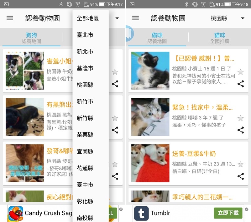 貓狗的部分臺灣寵物認養地圖和全國推廣認領養動物平臺都支援縣市分類,可以更快找到離你比較近的資訊,缺點是沒辦法過濾已認養的訊息,有的會顯示在標題有的要點進去查看內文,但建議都還是直接連絡確認比較好。