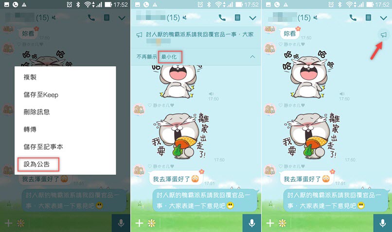 長按聊天室中的訊息(無論是自己還是其他人發出的)會出現選項,選擇「設為公告」就會出現在聊天室最上方,如果覺得佔位置也可以最小化到右上角。