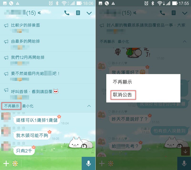 這項功能無論個人或群組都能使用,要注意的是置頂公告大家都有設定及取消的權限,希望不要造成群組吵架的根源啊。