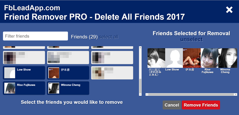 接著就會開新分頁分析出你所有的朋友,雖然這個示範的帳號朋友不多,看從這個頁面檢視真的快多了,點選要刪除的朋友後會加在右邊名單,再點一次可取消,確定就按下「Remove Friends」。