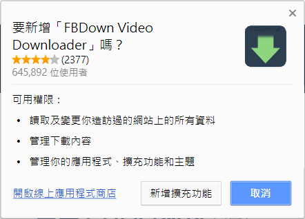 如果下載 Facebook 影片的頻率很高,也可以安裝擴充套件,點新增。