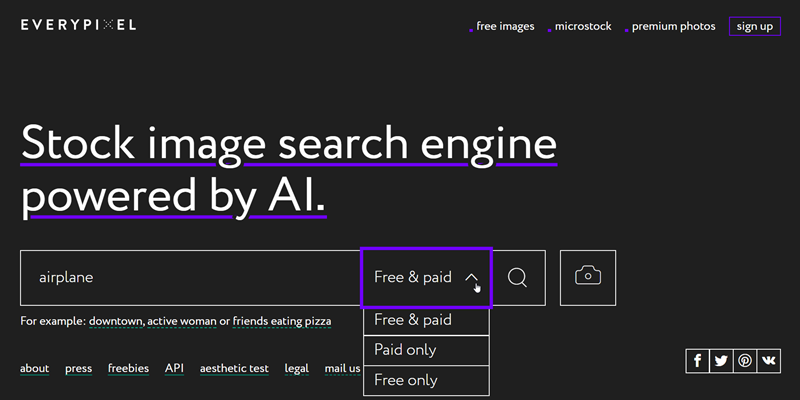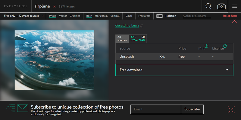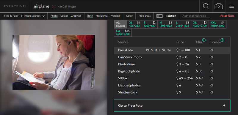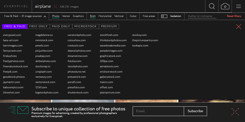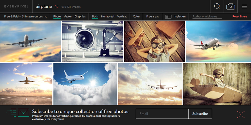 進到「Everypixel」網站同樣輸入「airplane」,可選擇要看免費、付費圖片還是都有,點放大鏡。
