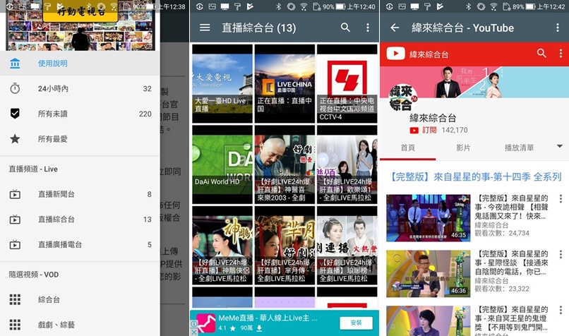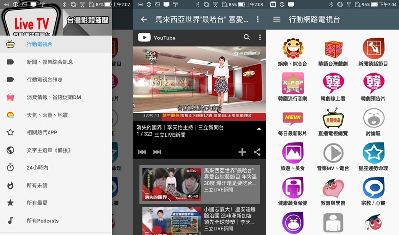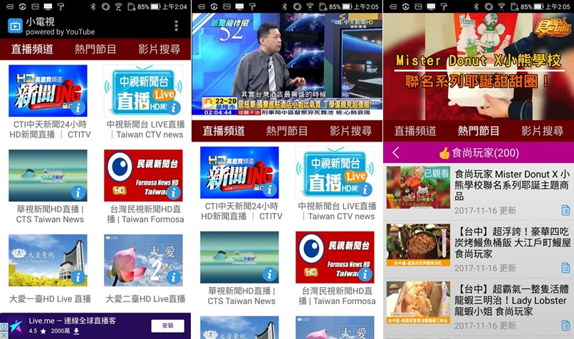 這款就是通通來自 YouTube,直播和分集節目都有,因為也是連 YouTube 所以畫質和速度什麼的都差不多,差在介面比較醜。