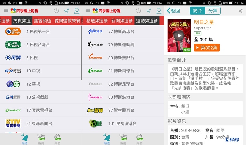 各種類型的節目都有,比較特別的是有立法院實況頻道,另外就是除了免費項目外都要註冊會員登入,但其實也不需要付費,其他像視窗解析度、控制音量等手勢操作還不錯用。
