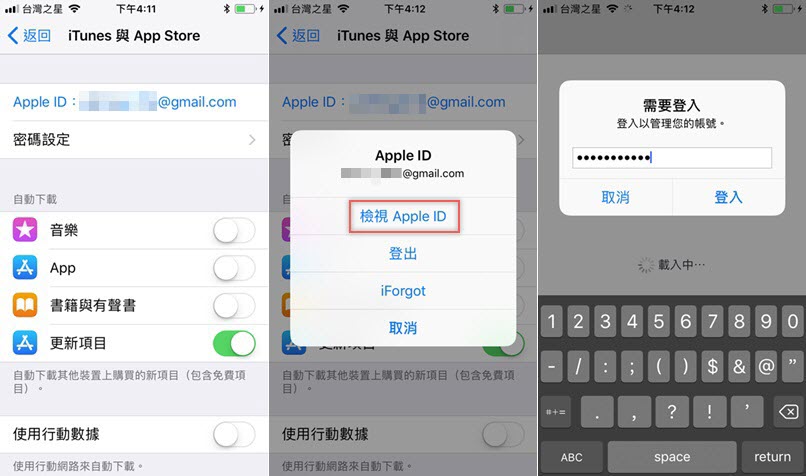 步驟很簡單,先到設定區找到 iTunes 與 App Store,點最上方的 ID 會跳出視窗,點「檢視 Apple ID」後,輸入密碼登入。