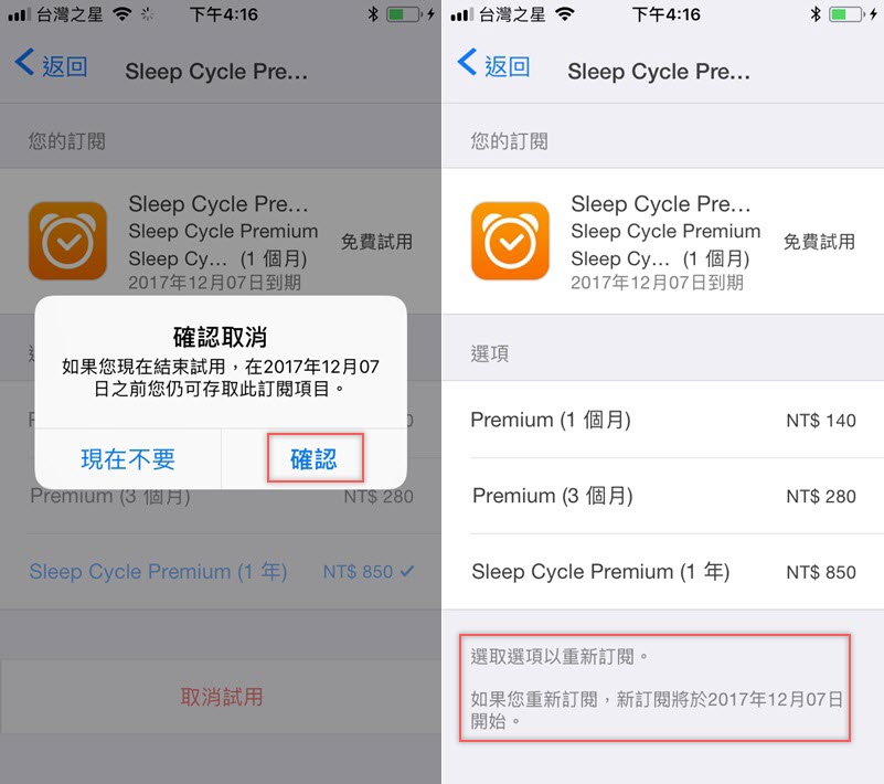 點取消試用的話,會再提示你什麼時候可再重新訂閱,這就視你當初下載或訂閱的時間而定,建議大家都檢查一下手機,搞不好會發現訂了什麼 APP 自己卻不知道。