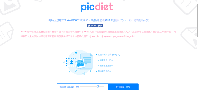 首頁下方調整輸入品質,預設是 75%,點「選擇你的圖片」上傳檔案。