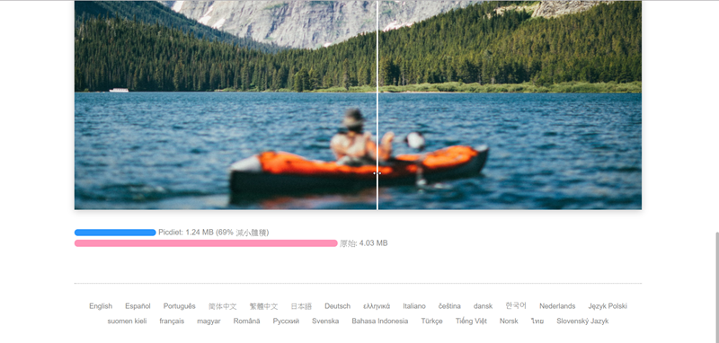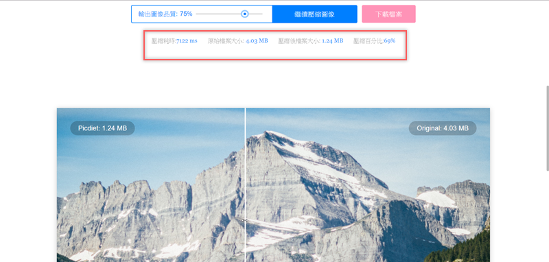 上傳同時進行壓縮,完成後會顯示花費時間、壓縮前後的大小與百分比,像這張照片花了 7 秒左右,從 4.03MB 縮到 1.24MB,縮了 69%,圖片上面有白色滑桿可左右移動來對照,基本上兩邊畫質看不出什麼差異,算蠻成功的,可下載。