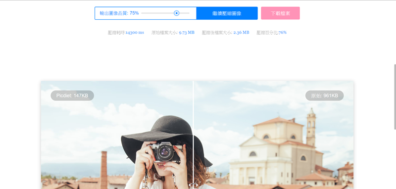 再來試試批次壓縮 26 張大小不一、尺寸也相異的照片,花了 14 秒左右,從 9.03MB → 2.36MB 壓縮了 76%,省了不少空間,同樣會顯示滑桿可讓你左右對照處理後的品質,滿意就下載吧。