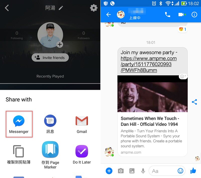 邀請其他好友一起來聽,選擇要分享的工具例如 Messenger,傳送後對方點連結就能加入,當然也要先下載 APP。