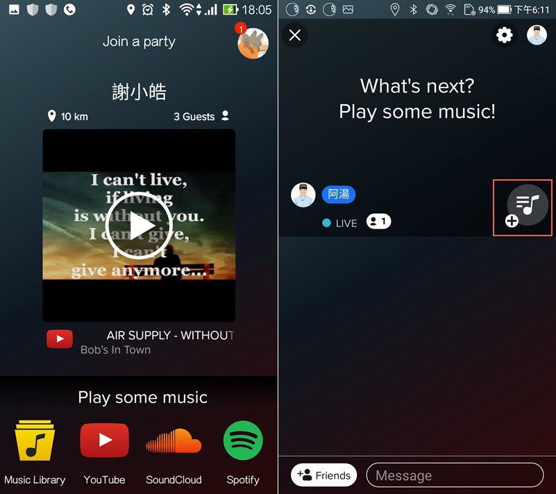 試著自己建立 Party,選擇 YouTube、SoundCloud、Spotify 或自己手機裡的音樂。