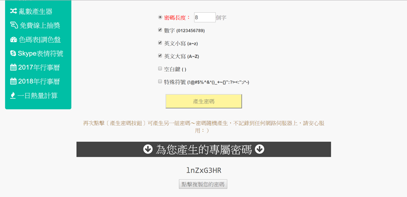 想要設一個不一樣的密碼或是兌換碼等隨機英數設置,點一下馬上生成。