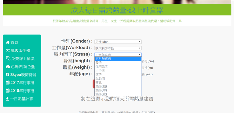 不同性別、身高體重、運動量、壓力源下的每日需求熱量建議,也能用這個計算出來。