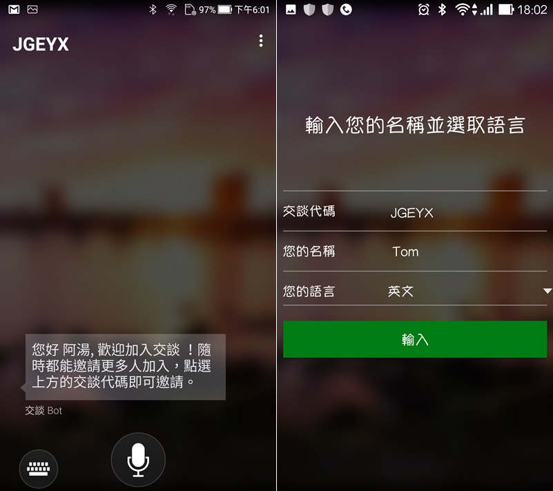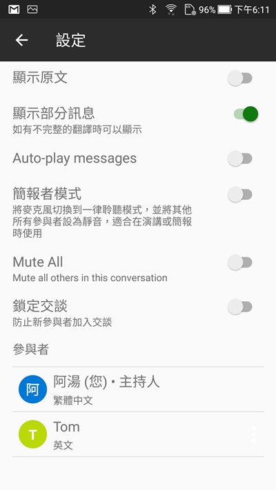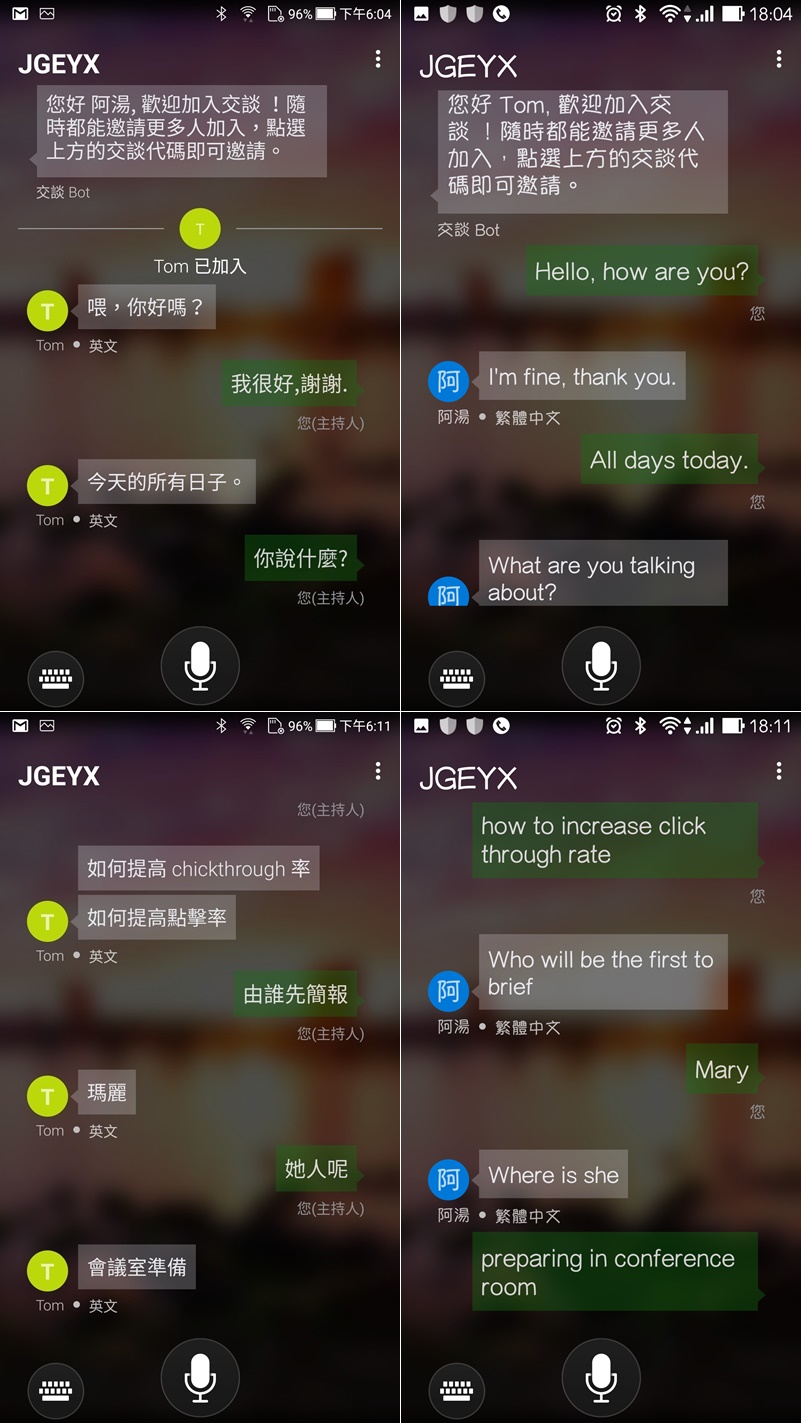 然後就可以開始對話了,按下麥克風你一句我一句的對話,並同步翻譯出來,真的增加不少效率,想像如果是外國主管來開會,就不用請一個人在旁邊翻譯,只要大家點加入就能用自己熟悉的語言進行,有些比較不準的地方,例如用鍵盤輸入錯誤,就只好自己理解了。