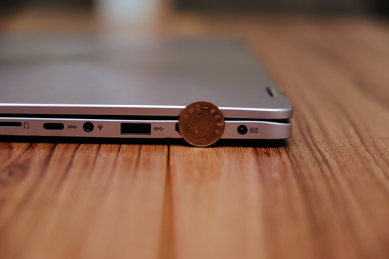 機身厚度僅 13.9mm,阿湯也放個 1 元硬幣給大家做比對,有搭載獨立顯卡且為二合一的 14 吋翻轉筆電來說,13.9mm 真的是相當的纖薄,兼具輕便與效能的最佳選擇啊。