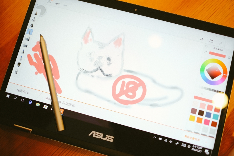 順帶一提,隨機附贈的這款 ASUS Pen ,很接近一般筆的手感,且擁有 1024 階感壓(可偵測到 10-300g 的力道),筆電裝有電池可更換,可連續使用 18 個月,筆上有二個按鍵也可做為功能鍵,像是按住下方的鍵可以直接當做橡皮擦,不需要再去點選筆刷功能。
