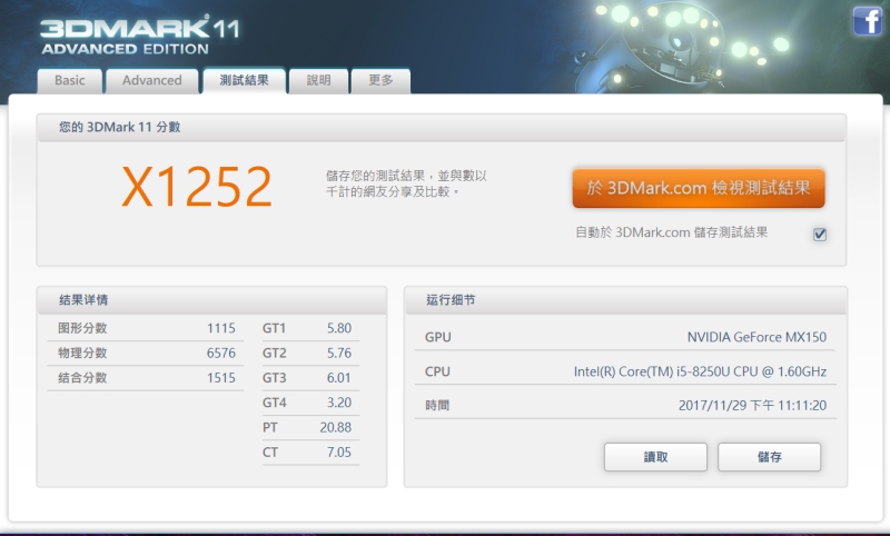 透過 3KMark 11 進行 Full HD 的效能測試,獲得 X1252 的分數,基本上用在修圖、跟一般影片剪輯是沒問題的。