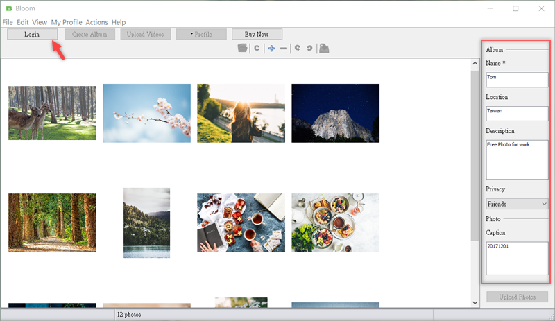 在右欄編輯好相簿名稱、地點、簡介並設定權限,跟臉書一樣可設個人、朋友或公開,但有一個缺點是沒辦法輸入中文,只好傳上去再更改,完成後點左上角「Login」。