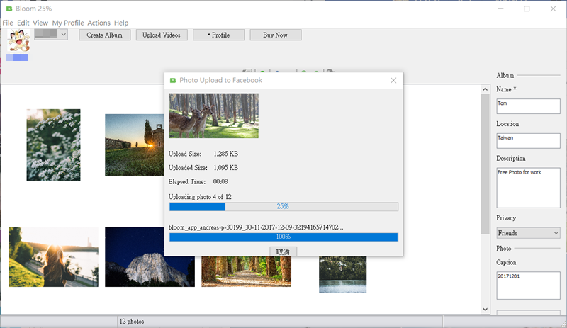 阿湯平常是很少一次傳大量照片上 FB,都是一張一張貼動態比較多,前兩天有個出國回來的朋友將整個相機共一千多張相片放上臉書,不知道是不是網路太慢,花了快一小時而且還一直當掉,真的很費時費力,「Bloom」這套軟體可以讓你在自己電腦編輯好相簿或影音的名稱、地點、簡介後,再一次傳到臉書,也能調整檔案大小與觀看權限,速度比在臉書操作快多了,來看看。