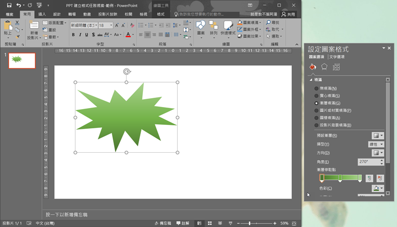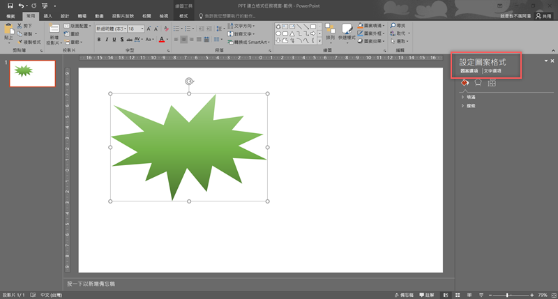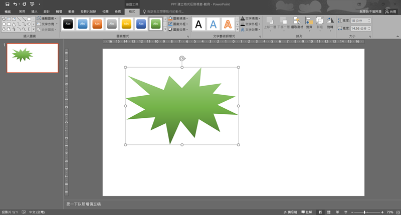 阿湯先隨便畫一個爆炸形狀,功能列就會自動轉成繪圖工具,也可套用上方提供的樣式,但畢竟不夠順手也不方便調整細節。