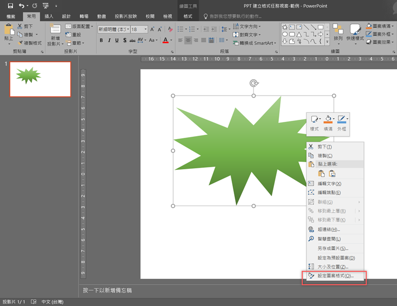 對著形狀按右鍵,選擇最下面「設定圖案格式」。