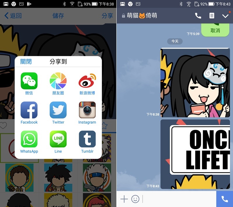 完成後可儲存,或從右上角分享出去,支援九種常用的社群連結如臉書、LINE、IG,但這邊不確定是 Android 版本問題還是手機關係,分享出去只會顯示部分圖片,但 iOS 版阿湯試過是完全沒問題的,匯出都是整張無切割。