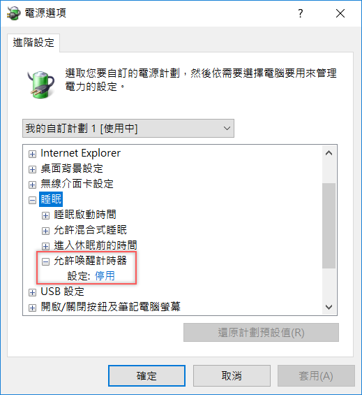 關於電源的所有設定都能在這裡進行,找到睡眠,點開底下的「允許喚醒計時器」並改成「停用」,再重開就完成了。