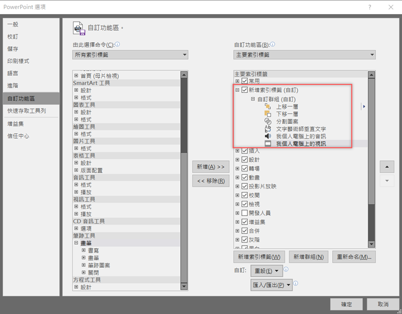 阿湯是叫出原本不在功能區的命令,並將需要的項目一一新增到右欄的自訂群組,像是上下移一層、分割圖案、文字藝術師垂直文字,以及加入電腦裡的音訊、視訊,數量沒有限制但不建議太多,失去快捷的本意。