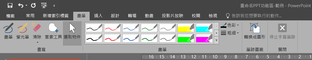 因應美術方面的需求,阿湯剛剛也將畫筆工具整組新增上去,成為另一個方便的頁籤,現在開始個人化你的 PPT 版面吧。