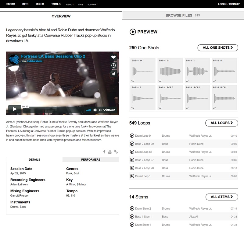 從縮圖進來,左邊是樂團介紹及 39 秒簡介影片,還有錄音日期、工程師、器材、流派等細節,右邊就是關於 One Shots、Loops、Stems 的內容。