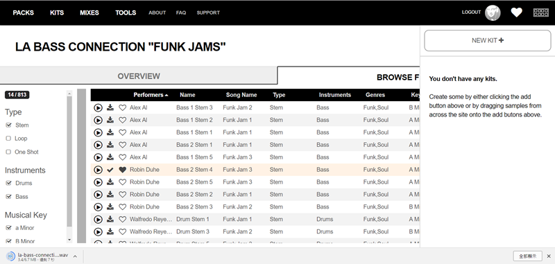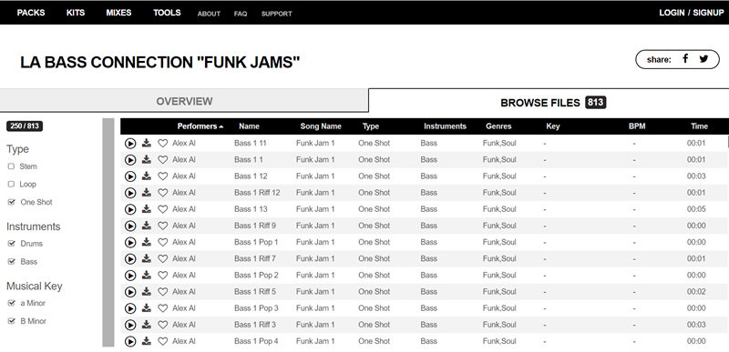往下看可點擊播放試聽,像這首「LA Bass Connection “Funk Jams”」內共有 813 個檔案,速度 96-110 BPM。